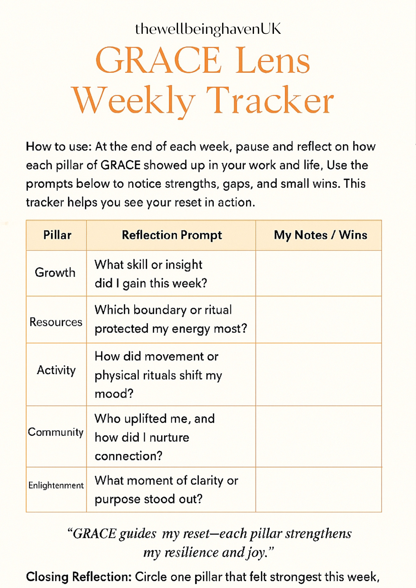 Welcome to The WellBeing Haven UK resource library – a collection of free, evidence‑informed tools to support burnout recovery, psychological safety and everyday resilience. Each worksheet and journal prompt is grounded in our trauma‑informed GRACE framework and designed to be simple, gentle and practical.